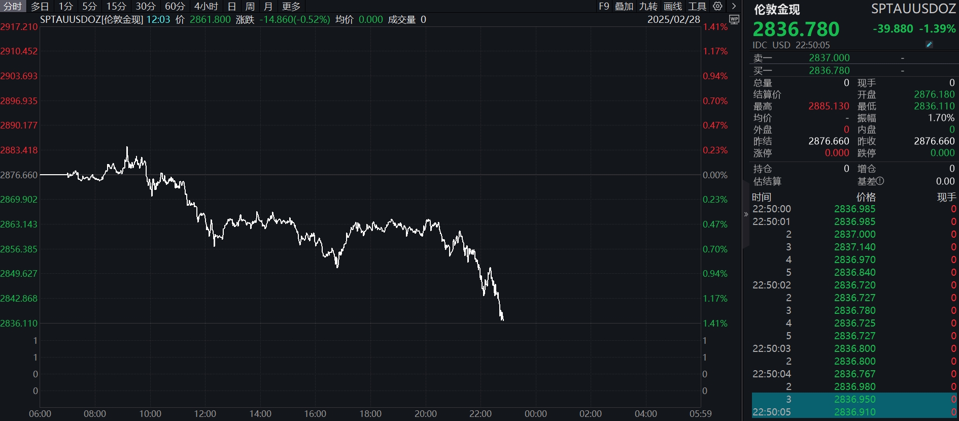 22:50 现货黄金跌破2840美元/盎司,日内跌1.39%。