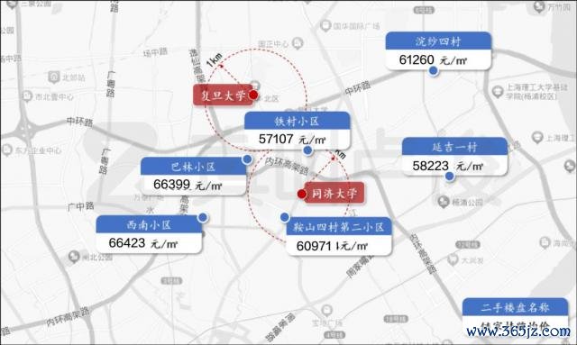 买在旁边对入学几乎没有半点影响,想要读名校还得靠鸡娃。我们也看了一下复旦大学(邯郸校区)和同济大学(四平路校区)所在的中原板块和旁边的曲阳板块。