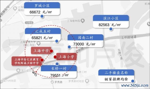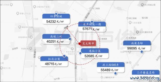 但仔细研究就会发现,上海中学旁边部分小区属于"上海小学 + 徐汇区教育学院附属实验中学"的双学区。而不是好学区的小区价格并没有什么优势。最终给小区房价带来提升的还是公办义务教育阶段的学校。交大附中周边没有优质公办初中小学,更能反映好高中对房价的影响。